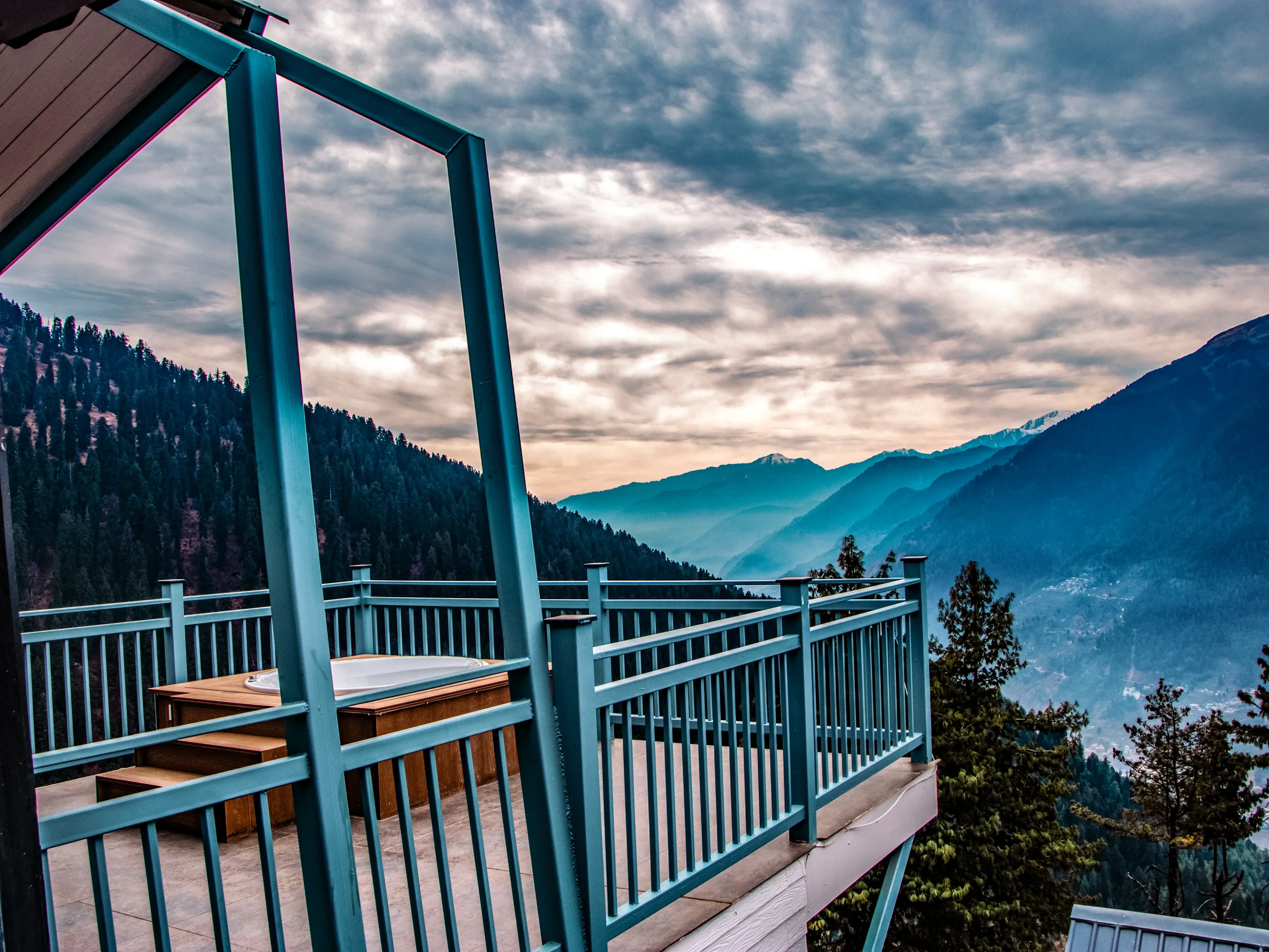 Expansive private balcony with jacuzzi overlooking snow clad mountains